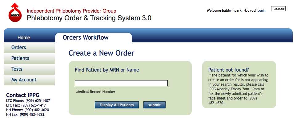 - To create an order you must first find a patient. From the Home Screen type the Medical Record Number (MRN) of the patient for whom the order is for in the Patient MRN form field, then click the Submit button.